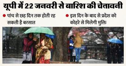 उत्तरोत्तर दो सक्रिय पश्चिमी विक्षोभों के प्रभाव से 22 जनवरी से पश्चिमी उत्तर प्रदेश में वर्षा का दौर शुरू हो सकता है। मौसम विभाग के अनुसार, बारिश का यह दौर 5 से 6 दिन तक रहेगा जिसकी वजह से पूर्वी उत्तर प्रदेश तक भी व्यापक वर्षा होने की संभावना है। हालांकि इस दौरान तापमान में बढ़ोतरी से ठंड से थोड़ी राहत मिलने के आसार है। रविवार देर रात प्रदेश में राजधानी लखनऊ समेत कई जगहों पर छिटपुट बारिश भी हुई लेकिन सोमवार को दिन में तापमान में अच्छी खासी बढ़ोतरी महसूस की गई। राजधानी लखनऊ में ही दो दिन के भीतर न्यूनतम तापमान में आश्चर्यजनक ढंग से 7 डिग्री की बढ़ोतरी दर्ज की गई।