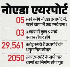 नोएडा इंटरनेशनल एयरपोर्ट में पहले चरण में एक रनवे बनकर तैयार हुआ है। इसके बाद तीन चरण में और इसके काम को पूरा किया जाएगा और कुल 6 रनवे बनकर तैयार हो जाएंगे। इस एयरपोर्ट को एशिया के सबसे बड़े एयरपोर्ट के तौर पर विकसित किया जा रहा है। एयरपोर्ट की कुल अनुमानित लागत 29561 करोड़ रुपये है। 2050 तक जेवर एयरपोर्ट के सभी चार चरणों का निर्माण पूरा किया जाना है। पहले चरण की निर्माण लागत 4588 करोड़, दूसरे चरण में निर्माण की अनुमानित लागत 5983 करोड़, तीसरे चरण की अनुमानित लागत 8415 करोड़ और चौथे चरण के निर्माण में होने वाले खर्च की अनुमानित लागत 10575 करोड़ है।